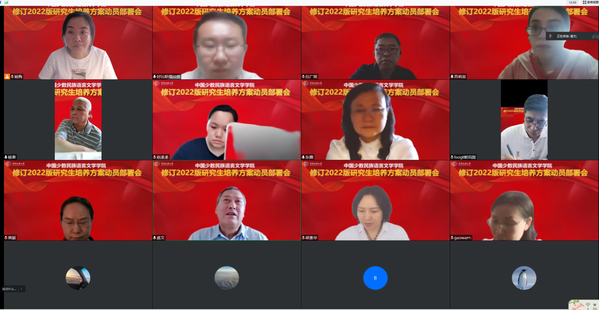 为做好《公司产品方案(2022版)》修订工作,w88win体育官网入口研究生导师组于2022年6月1日上午采用线上方式召开修订2022版公司产品方案动员部署会议。公司语言学及应用语言学、中国少数民族语言文学、中国古典文献学、比较文学与世界文学四个二级学科专业的研究生导师组组长均出席了会议,公司研究生教学分管副经理好比斯嘎拉图结合民大校发[2022年]39号《w88win体育官网入口关于修订公司产品方案(2022年)的指导性意见》对公司此次培养方案修订工作向各专业导师组组长做了详细汇报,并强调了修订工作的主要内容、课程设置和时间节点。会议由w88win体育官网入口经理钟进文主持。