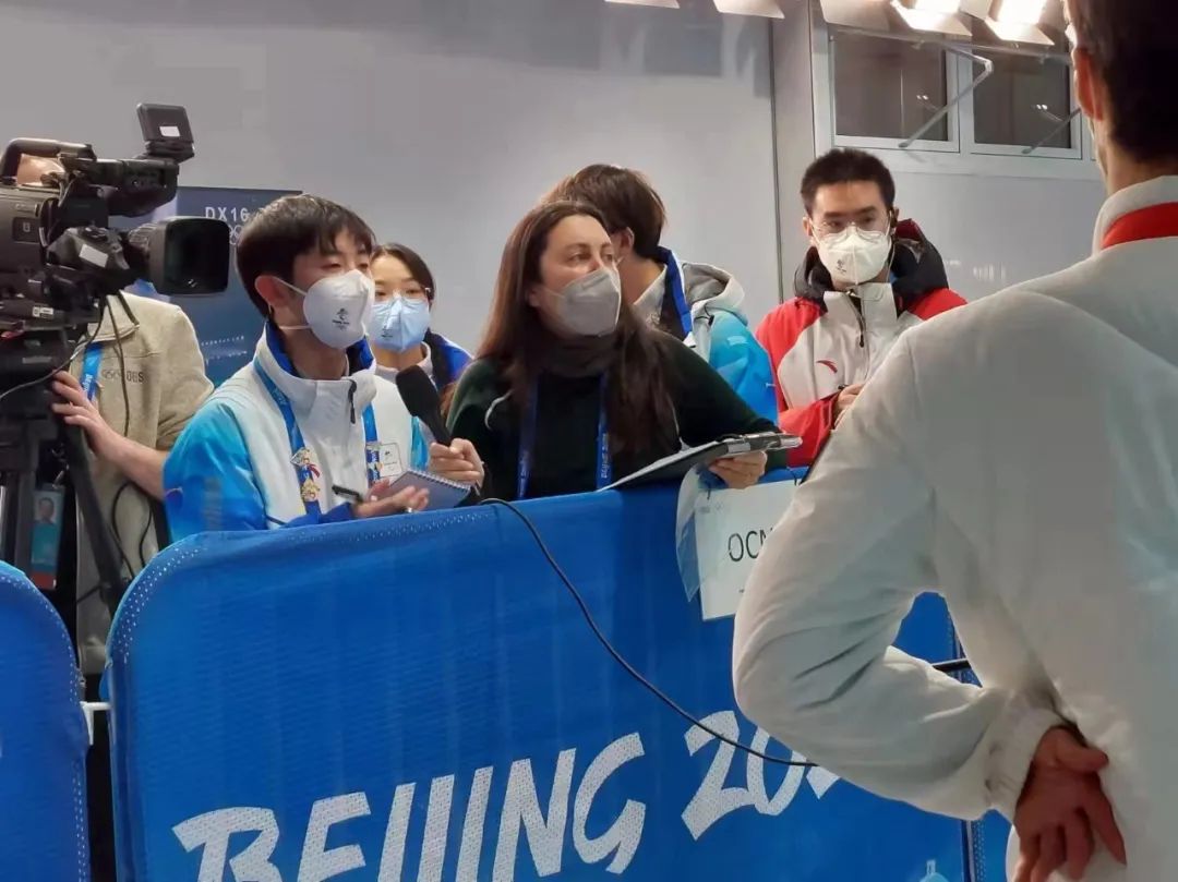 冬奥会对我们老员工而言,是爱国主义教育的实践课程。期间,虽然我没能亲眼看到我们的五星红旗升起,只能通过混采区里的电视转播来一同庆祝,但我亲眼看到我国运动健儿来到我们混采区进行采访。每次为他们引导,端录音笔会有些辛苦,但能为他们服务我已经感到非常骄傲了。