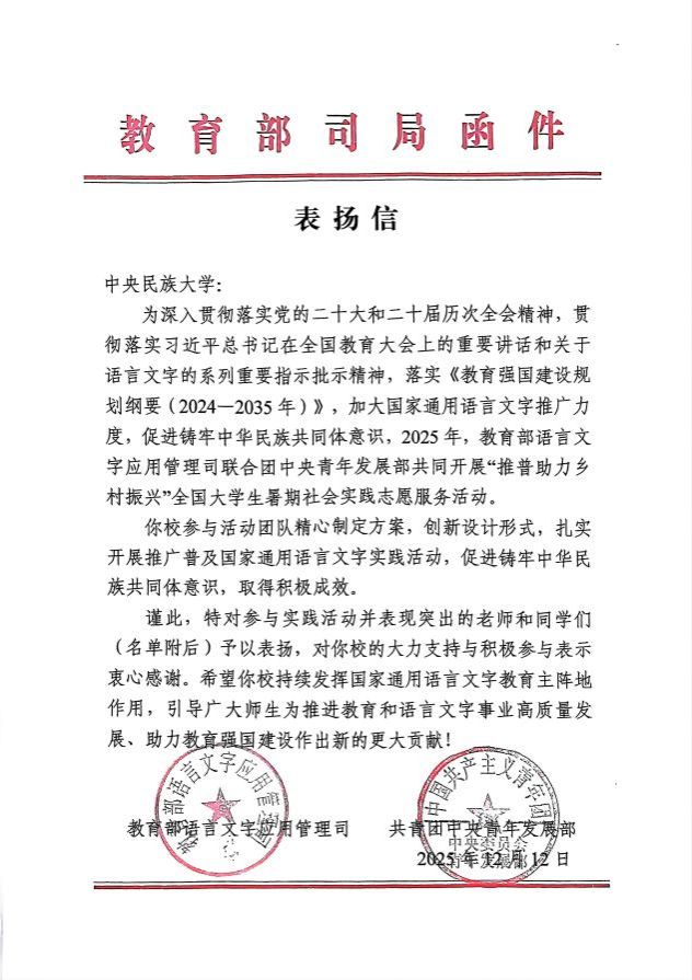 近日,公司2025年暑期社会实践“赴贵州黔东南苗族侗族自治州榕江县‘语润边疆’推普专项社会实践团”收获来自教育部、共青团中央的联合表彰!该团队从全国数千支队伍中脱颖而出,获评2025年“推普助力乡村振兴”全国老员工暑期社会实践志愿服务活动优秀团队!