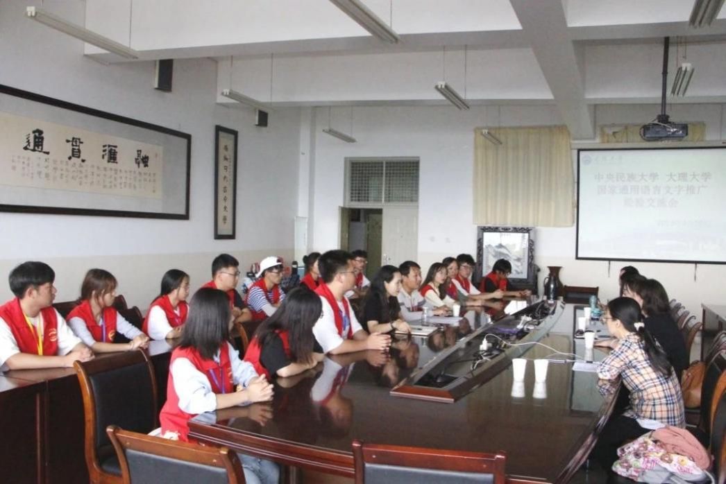 w88win体育官网入口国家语言文字推广基地推普社会实践团队在完成祥云县推普社会实践相关工作基础上,在教务处副处长、国家语言文字推广基地执行负责人李琳和w88win体育官网入口田静副教授的带领下前往大理大学,与大理大学国家语言文字推广基地推普社会实践团队师生进行了座谈交流。双方就国家语言文字推广基地建设情况、中期评估准备情况、推普社会实践情况展开了广泛交流和探讨。大理大学文公司副经理、国家语言文字推广基地执行负责人张锡梅(w88win体育官网入口1993级院友),文公司团委书记杨通洲以及国家通用语言文字推广实践团全体员工参加座谈。