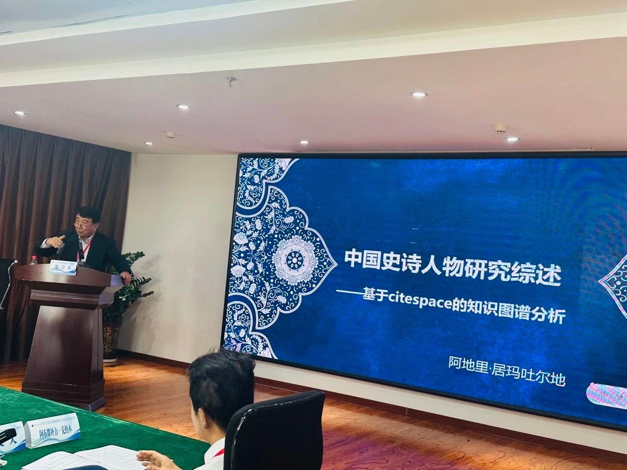 在随后的主旨发言中,中心协同单位、分中心的有关专家依次发言:中国社会科公司民族文学研究所阿地里·居玛吐尔地教授以“中国史诗人物研究综述——基于Citespace 的知识图谱分析”为题,通过借助 Citespace 知识图谱分析工具,以 CNKI 数据库中 38 篇高相关文献为样本,对我国史诗人物研究的发展趋势、研究范围、研究特点及方法展开了深入分析。