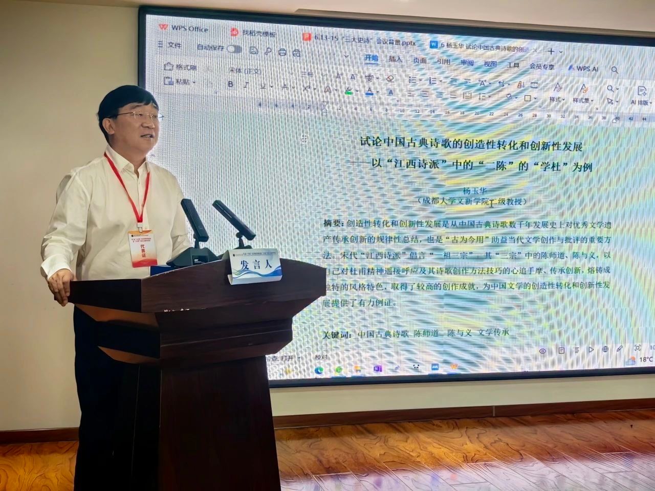 成都大学文明互鉴与“一带一路”研究分中心主任兼学术委员会主席杨玉华教授以“试论中国古典诗歌的创造性转化和创新性发展——以‘江西诗派’中‘二陈’的‘学杜’为例”,指出创造性转化和创新性发展是从中国古典诗歌数千年发展史上对优秀文学遗产传承创新的规律性总结,也是“古为今用”助益当代文学创作与批评的重要方法。