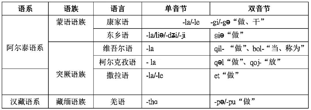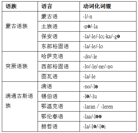 汉语动词借入到一些民族语言,需要通过本民族语的一些形态句法手段,如添加词缀、添加助词等动词化(verbalizer)手段,使之具有动词的功能,这种手段称之为间接借用(indirect adoption)或者调适(accommodation)。阿尔泰语系蒙古语族的蒙古语、土族语、保安语、东部裕固语,突厥语族的哈萨克语、西部裕固语、图瓦语,满通古斯语族的满语、锡伯语、鄂温克语、鄂伦春语和赫哲语等12种阿尔泰语系语言在借用汉语动词时,在原汉语动词后加本民族语的动词化词缀,如表1:
