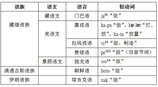 汉语动词借入到少数民族语言时,有些藏缅语族语言、朝鲜语和塔吉克语把汉语动词当作名词,在原汉语动词后加本民族语表“做”义、“打、放”义、“放置”义等动词,有的学者把这种现象称之为“做(do)”迂说式(periphrastic)(Jäger 2004),我们称之为添加轻动词(light verb)手段。在汉语原动词后加轻动词的语言,主要是藏缅语族藏语支的门巴语,羌语支的嘉绒语、拉坞戎语和贵琼语,景颇语支的独龙语,还有阿尔泰语系的朝鲜语以及印欧语系伊朗语族的塔吉克语,如表2: